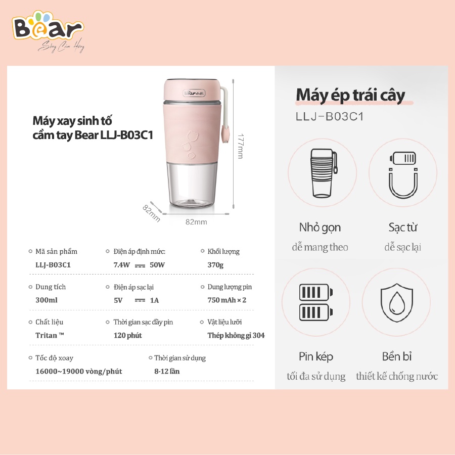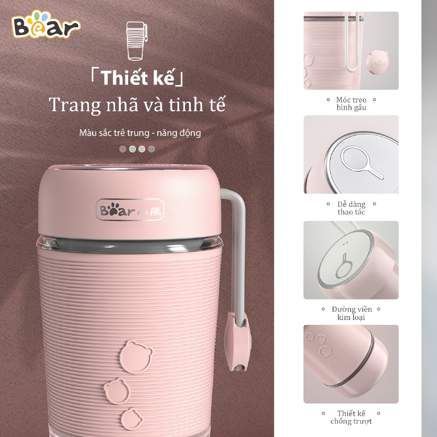 Máy Xay Sinh Tố Cầm Tay Mini Bear Công Suất Lớn, Không Ồn, Dung Lượng Pin Cao - LLJ-B03C1