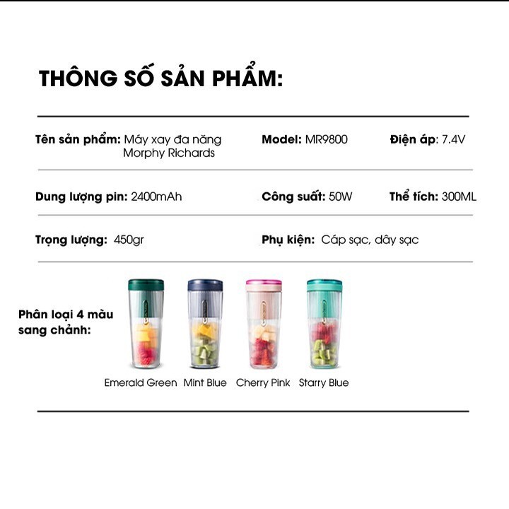 - Máy xay sinh tố cầm tay Morphy Richards MR9800 (300ml) sở hữu thiết kế thân hình trụ tinh tế, kiểu dáng nhỏ gọn tiện dụng, phù hợp đem theo khi đi du lịch cũng như dễ dàng di chuyển đến nhiều vị trí bạn mong muốn. Máy xay sinh tố mini MR9800 giúp mọi thực phẩm chế biến giữ nguyên được chất dinh dưỡng, đem lại cho bạn những món ăn, thức uống vô cùng bổ dưỡng và tốt cho sức khỏe.