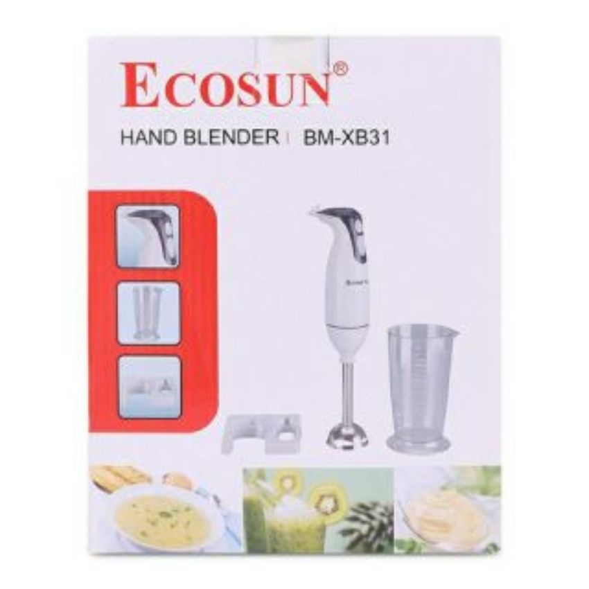Máy Xay Sinh Tố Cầm Tay Ecosun BM-XB31 là công cụ đắc lực hỗ trợ các bà nội trợ hiện đại chế biến thức ăn thật dễ dàng và nhanh chóng. Máy xay cầm tay Ecosun BM-XB31 kết hợp công suất 200W với chân máy xay được thiết kế độc đáo, mang lại kết quả xay mịn tuyệt vời cho món súp, thức ăn nhuyễn và đồ uống khuấy đều. Chế biến món ăn có lợi cho sức khỏe chưa bao giờ dễ dàng như vậy. Máy xay cầm tay Ecosun BM-SB31 với thiết kế gọn nhẹ, kiểu dáng hiện đại là sản phẩm hữu ích và tiện dụng cho người nội trợ đảm đang và hiện đại.Máy xay cầm tay Ecosun XB31 1