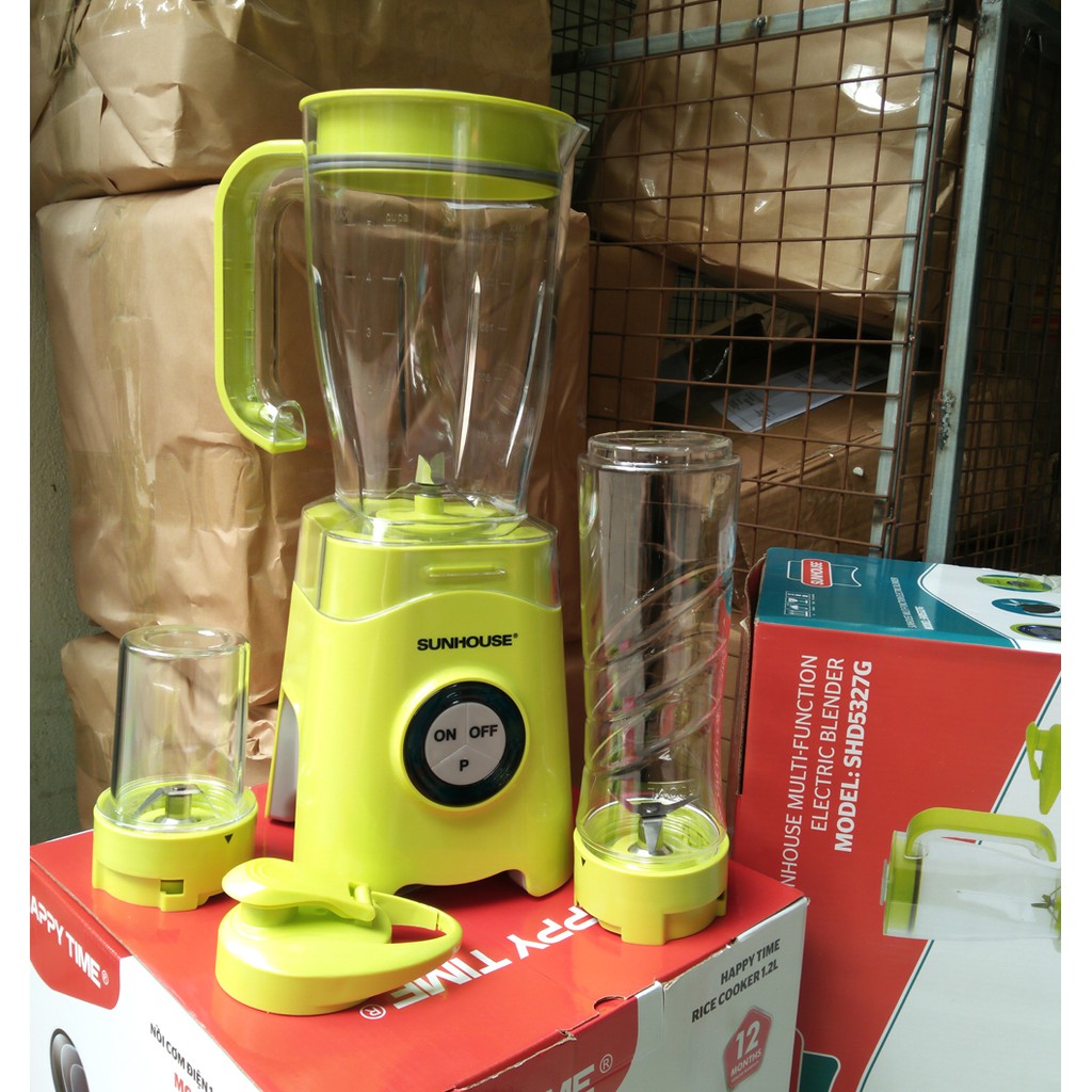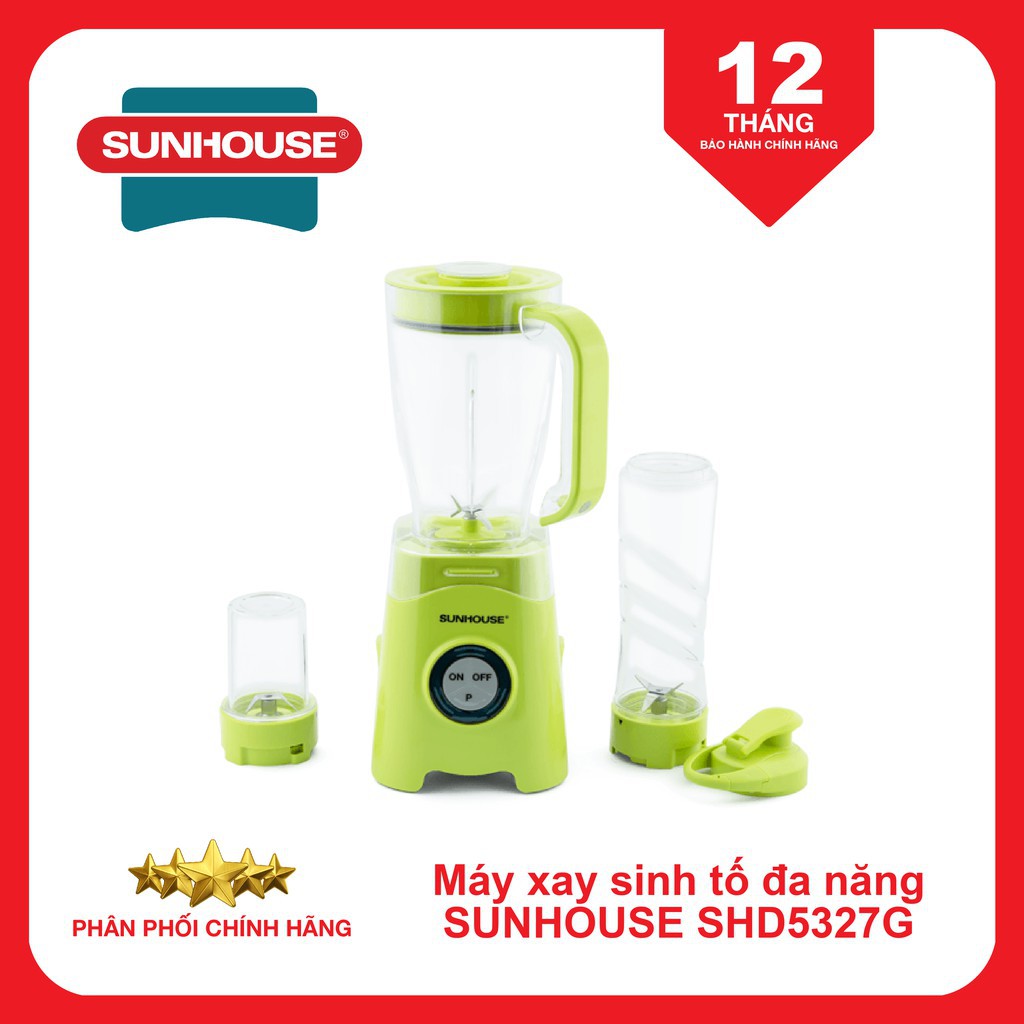 #máyxaysinhtốsunhouseMáy xay sinh tố đa năng SUNHOUSE SHD5327G có thiết kế hiện đại, màu xanh tươi tắn trẻ trung với một cối xay sinh tố, 1 cối xay thực phẩm khô và một bình xay – uống 2 trong 1 vô cùng tiện lợi. Với việc sở hữu một chiếc máy xay SHD5327G trong gia đình, bạn sẽ luôn có những ly nước ép sánh mịn và thơm ngon.