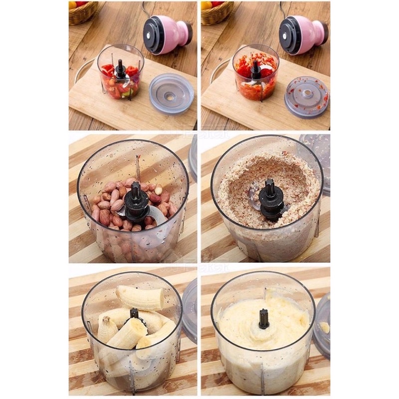 - Gồm 3 phần chính, 1 motor với 2 cấp độ xay, 1 cối chứa thịt xay bằng nhựa, 2 lưỡi dao tác động kép.
