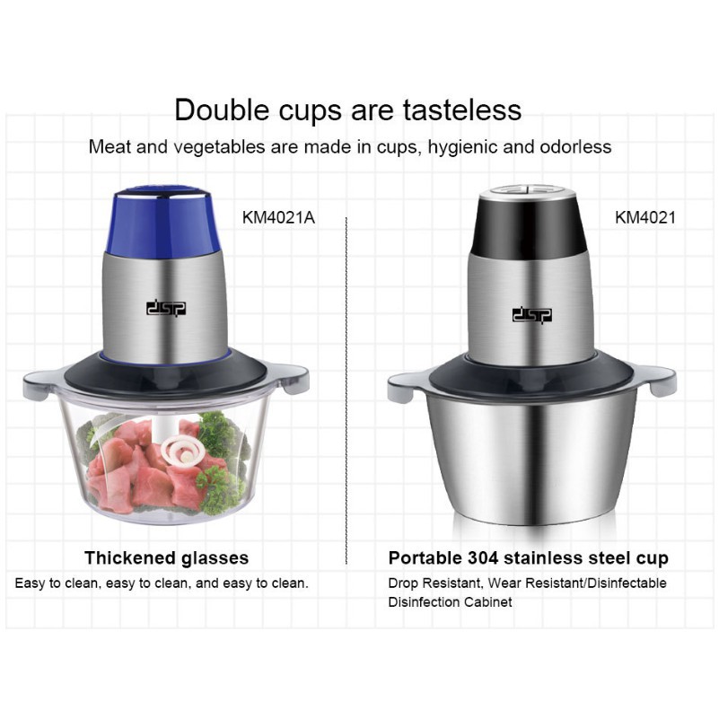 Máy xay thịt 2 lưỡi kép cao cấp thương hiệu DSP nhập khẩu - Dung tích: 2L- Công suất: 300W - 2 màu: Xanh, Đen BạcMáy Xay Thịt DSP KM4021 sở hữu thiết kế nhỏ gọn, tinh tế, hiện đại, đây sẽ là một phụ kiện tuyệt vời giúp cho những người nội trợ chuẩn bị những bữa ăn gia đình một cách nhanh chóng nhất. Phần chân đế của máy chống trượt hiệu quả cho phép máy đứng vững trên nhiều bề mặt khác nhau đảm bảo an toàn cho thiết bị và người dùng khi sử dụng, đồng thời cũng giúp máy vận hành êm ái, nhẹ nhàng hơn. Vỏ máy làm từ thép không gỉ chắc chắn, chống bám bụi bẩn tốt, dễ dàng lau chùi và vê sinh.