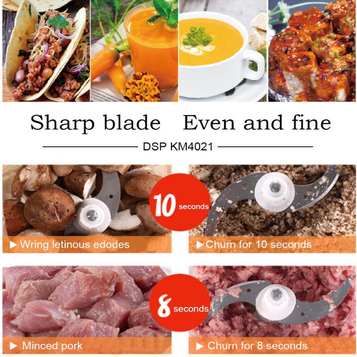 - Máy xay thịt DSP có công suất 300W, giúp bạn xay trộn các loại thực phẩm ướt và mềm cho độ nhuyễn mịn cao. Động cơ của máy hoạt động mạnh mẽ giúp xay thịt dễ dàng và nhanh chóng.