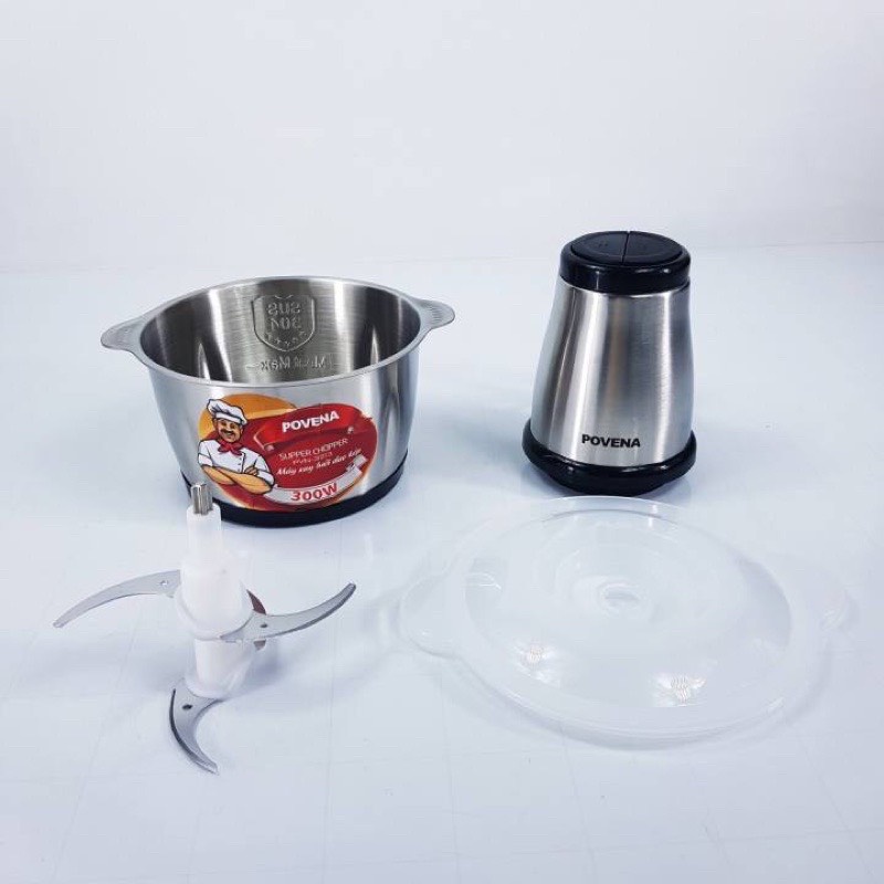 Thiết Bị Điện Gia Dụng > Đồ gia dụng nhà bếp > Máy chế biến thực phẩm & Xay thịt || Máy xay thịt cối inox 304 và cối thủy tinh Povena, dung tích cối 2L, công suất 300W, 4 lưỡi dao, trục inoxCòn hàng