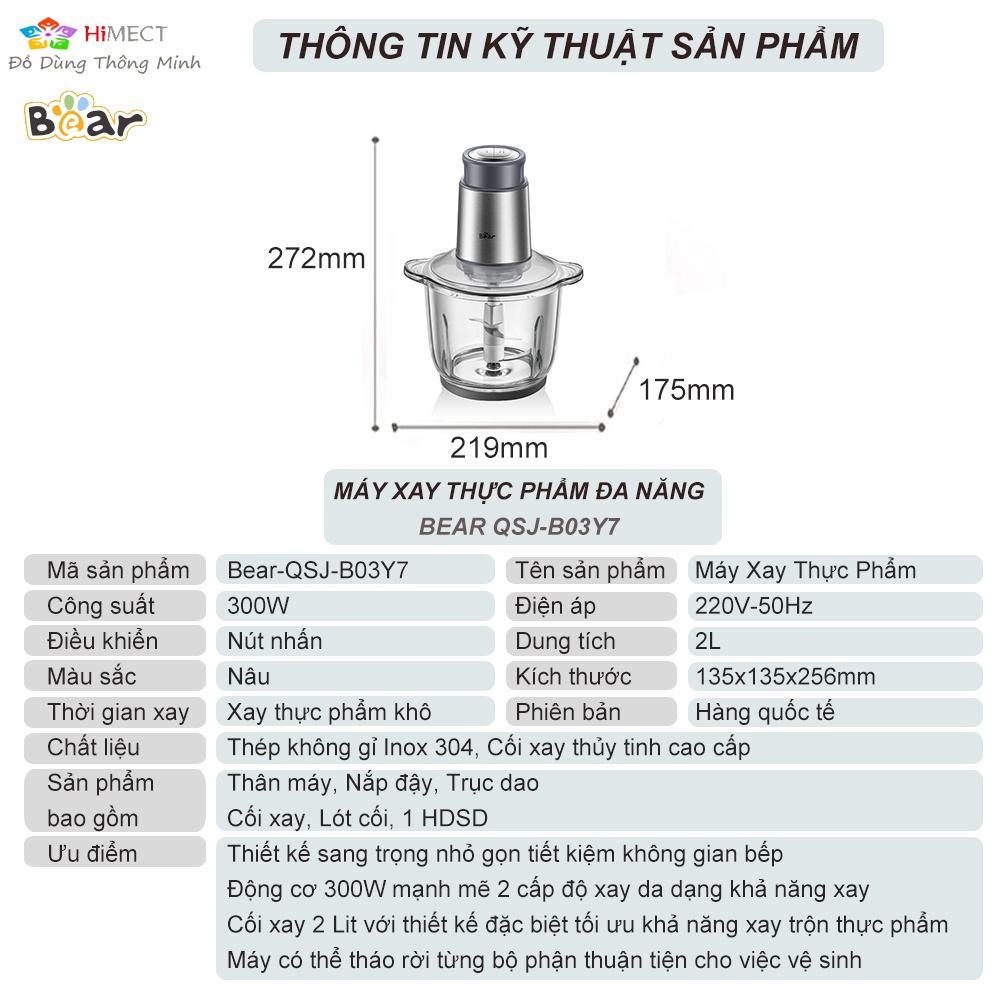 Máy Xay Thịt Mini Đa Năng Bear Cối Thủy Tinh 2 Lít Bảo Hành 18 Tháng - HiMect✔️ Máy xay đa năng 2L Bear QSJ-B03Y7 sở hữu thiết kế đơn giản với dung tích lớn cho phép xay khối lượng thực phẩm lớn, phù hợp với mọi gia đình. Công suất xay lên đến 300W máy xay thực phẩm Bear giúp bạn xay thịt, cá, rau củ,... và nhiều loại thực phẩm khác nhanh gọn.