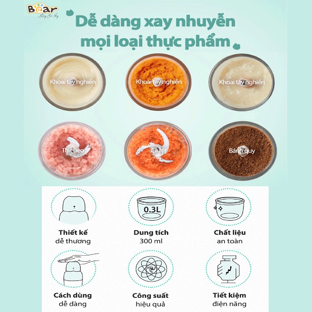✔️Máy xay cho bé ăn dặm Bear có thể xay nhuyễn các loại thực phẩm mềm sau khi sơ chế như: cà rốt, khoai tây, bánh quy, hành tây, rau xanh,... Để xay thịt, bạn nên cắt nhỏ thịt thành từng miếng, sau đó cho vào máy xay một lượng vừa đủ để không vượt quá giới hạn của cốc xay.