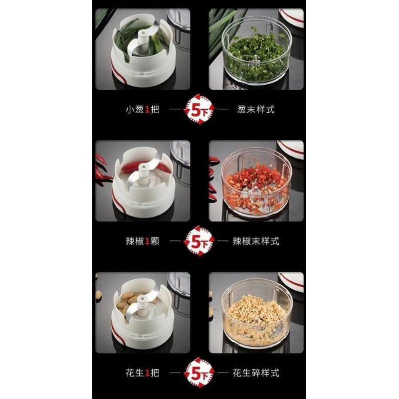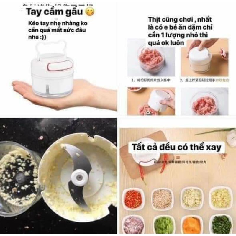 ✅Cực kì dễ dàng, chỉ cần cho đồ vào, đậy nắp, kéo & thả phần dây kéo liên tục, dây kéo sẽ làm quay lưỡi cắt bên trong, xay nhuyễn đồ ăn không hề vất vả.