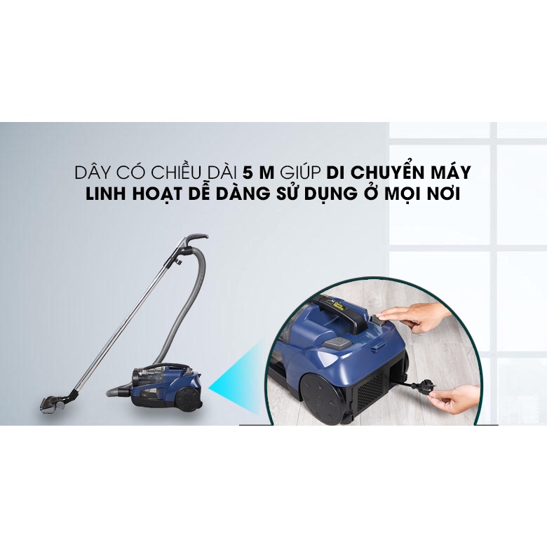 Máy hút bụi Panasonic có màu xanh đen tinh tế, sang trọng, kích cỡ gọn nhẹ cùng thiết kế bánh xe giúp di chuyển linh hoạt, nhanh chóng