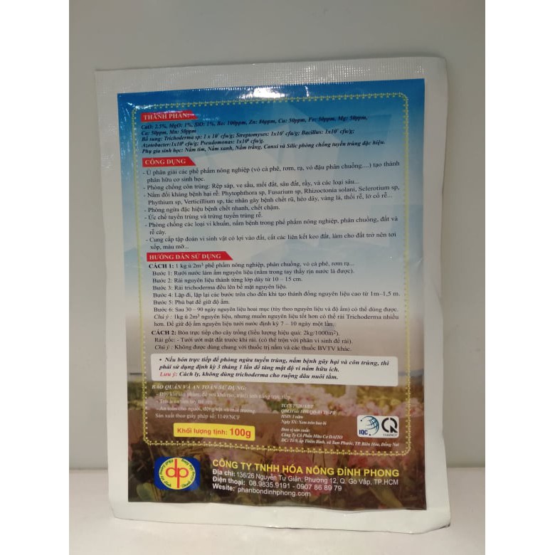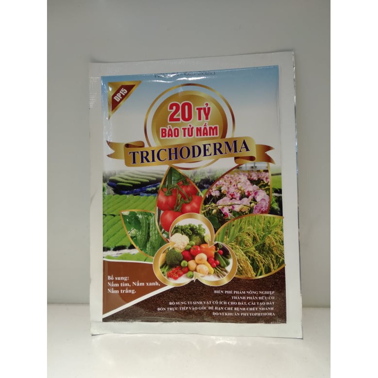 men ủ sinh học Trichodema 100gThành phần : Trichoderma sp: 1 x 10\7 cfu/g; bacillus 1 x 10\7 cfu/g . Phụ gia : sinh học , nấm tím , nấm xanh , nấm trắng , canxi và silic phòng chống tuyến trùng đặc hiệu .