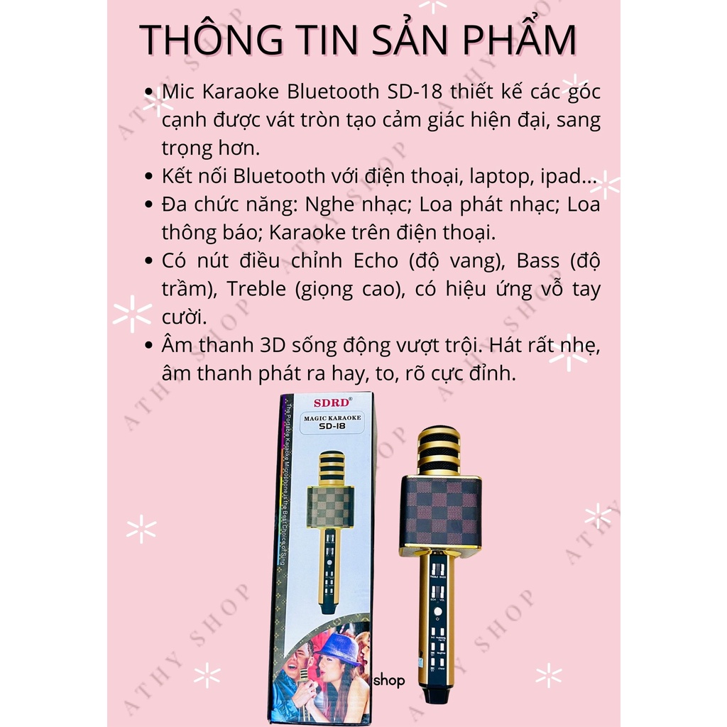 Thiết Bị Âm Thanh > Micro thu âm || MIC KARAOKE BLUETOOTH SD-18 kết nối không dây sang trọng âm thanh hay không bị rè chống hú và có hiệu ứng vỗ tay, cườiCòn hàng