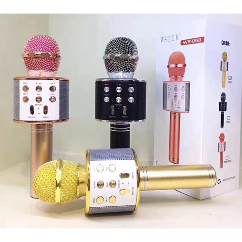- Sở hữu nhiều ưu điểm nổi bật, micro karaoke bluetooth WSTER WS-858 xứng đáng là một trong những mặt hàng “HOT” được nhiều người săn đón nhất hiện nay. một mẫu thiết kế hoàn toàn mới lạ, âm thanh nghe cực hay, không bị rè, công suất 5W rất lớn cho nhu cầu cá nhân, micro bắt tiếng cực nhạy nên hát karaoke cực sướng, ngoài ra bạn còn sử dụng được tính năng nghe nhạc giải trí như 1 loa Bluetooch, nghe qua thẻ nhớ, nghe bằng tai nghe, chụp hình Selfie từ xa và thu âm bài hát với thời gian sử dụng từ 3 - 5 giờ liên tục.