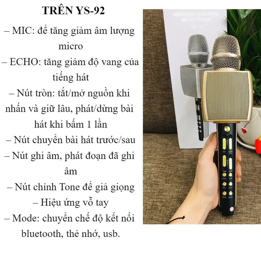 MIC KARAOKE BLUETOOTH YS 92 - MICRO KÈM LOA CAO CẤP - LIVESTREAM - ÂM THANH SỐNG ĐỘNG - THẺ NHỚ - GHI ÂM