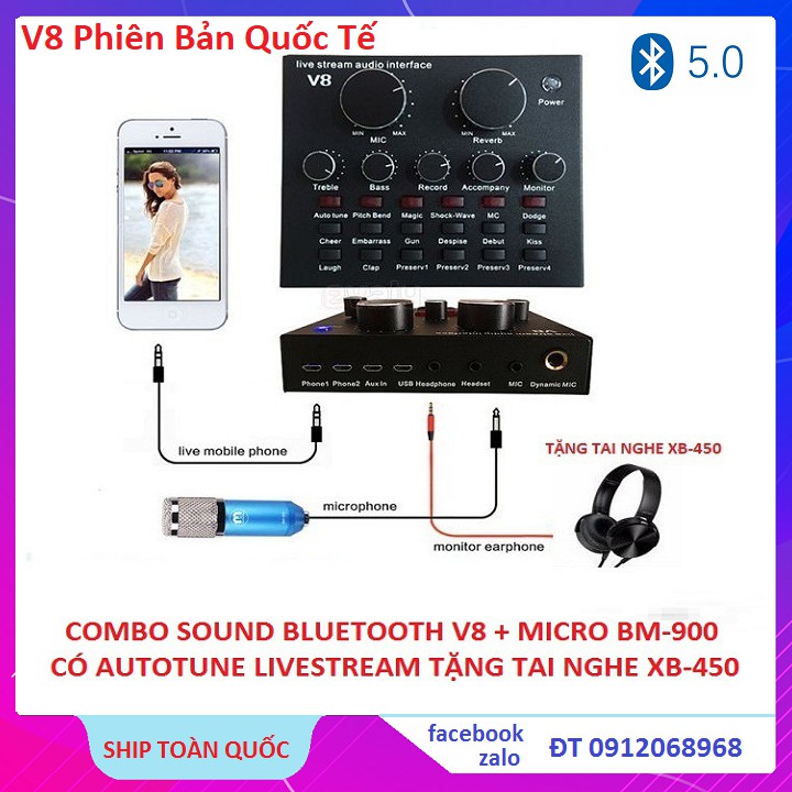Combo Soundcard V8 AQTA Chính Hãng Bluetooth + Mic Karaoke Livetream BM 900, Có AutoTuneShop Có Tặng Tai Nghe XB-450 Chuẩn Phòng Thu