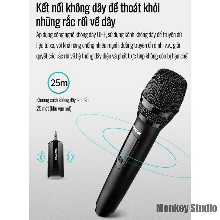 • Công nghệ không dây UHF được sử dụng để loại bỏ các kết nối dây phức tạp, do đó việc phát sóng trực tiếp, hát karaoke và bài phát biểu không còn bị hạn chế;