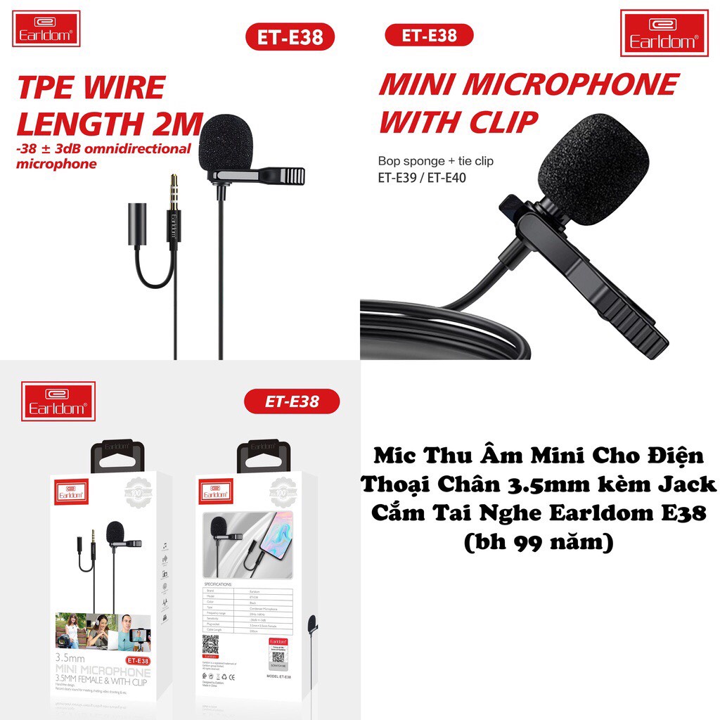 Giới thiệu Mic Thu Âm Micro Ghi Âm Mini Cho Điện Thoại Chân 3.5mm kèm Jack Cắm Tai Nghe Earldom E38 Livestream Học Trực Tuyến