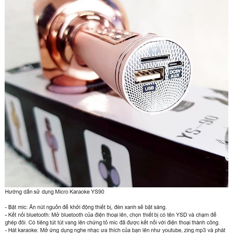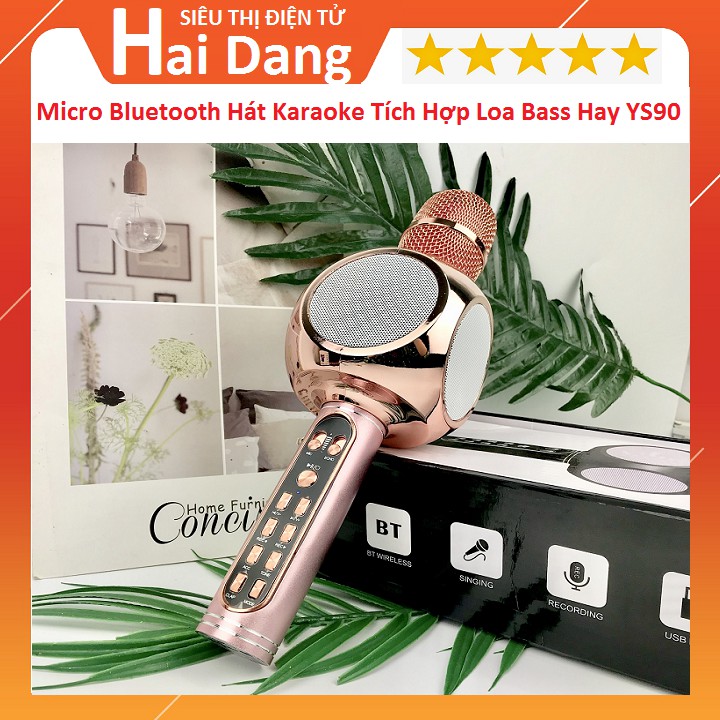 Micro bluetooth hát karaoke tích hợp loa bass hay YS90, mic bắt giọng, âm thanh trong lớn, gắn usb, thẻ nhớ, cổng 3.5Micro bluetooth hát karaoke tích hợp loa bass hay YS90 là phiên bản mới nhất của dòng micro Bluetooth Karaoke kèm loa YSD đình đám trên thị trường. Đây là thiết bị giúp kết nối với điện thoại Smartphone thông qua sóng Bluetooth.