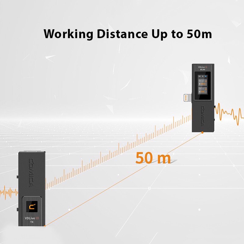 Phạm vi làm việc lên tới 50m (trong môi trường lí tưởng), bộ phát và bộ thu đều có pin sạc tích hợp cung cấp thời gian hoạt động lên đến 4 giờ.