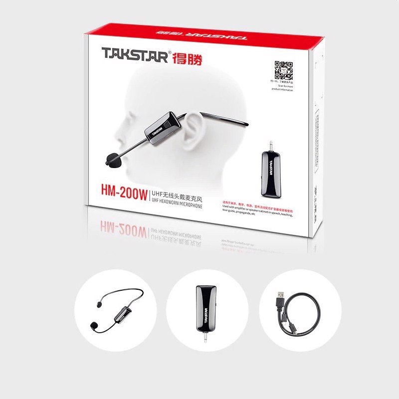 Micro gài tai Takstar HM-200W là micro không dây chuyên dùng cho các bộ loa trợ giảng, loa hội chợ, loa kéo. HM-200W sử dụng sóng UHF với 40 dải băng tần riêng biệt, cho phép hoạt động tới 40 bộ thu phát trong cùng 1 khu vực với cự ly thu phát lên tới 50m.
