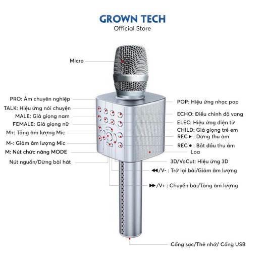 Micro karaoke bluetooth cầm tay mini GrownTech YS 96 đa năng kèm loa blutooth bass trầm ấm hỗ trợ ghi âm