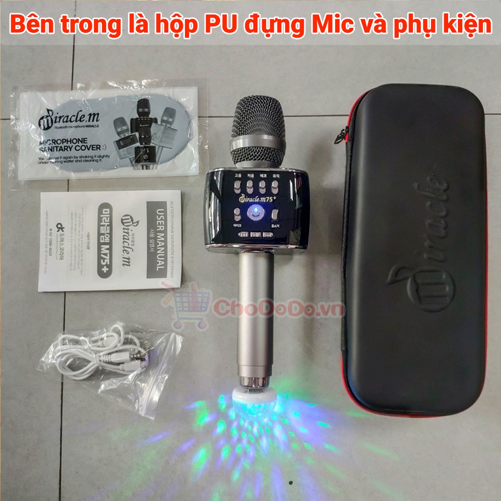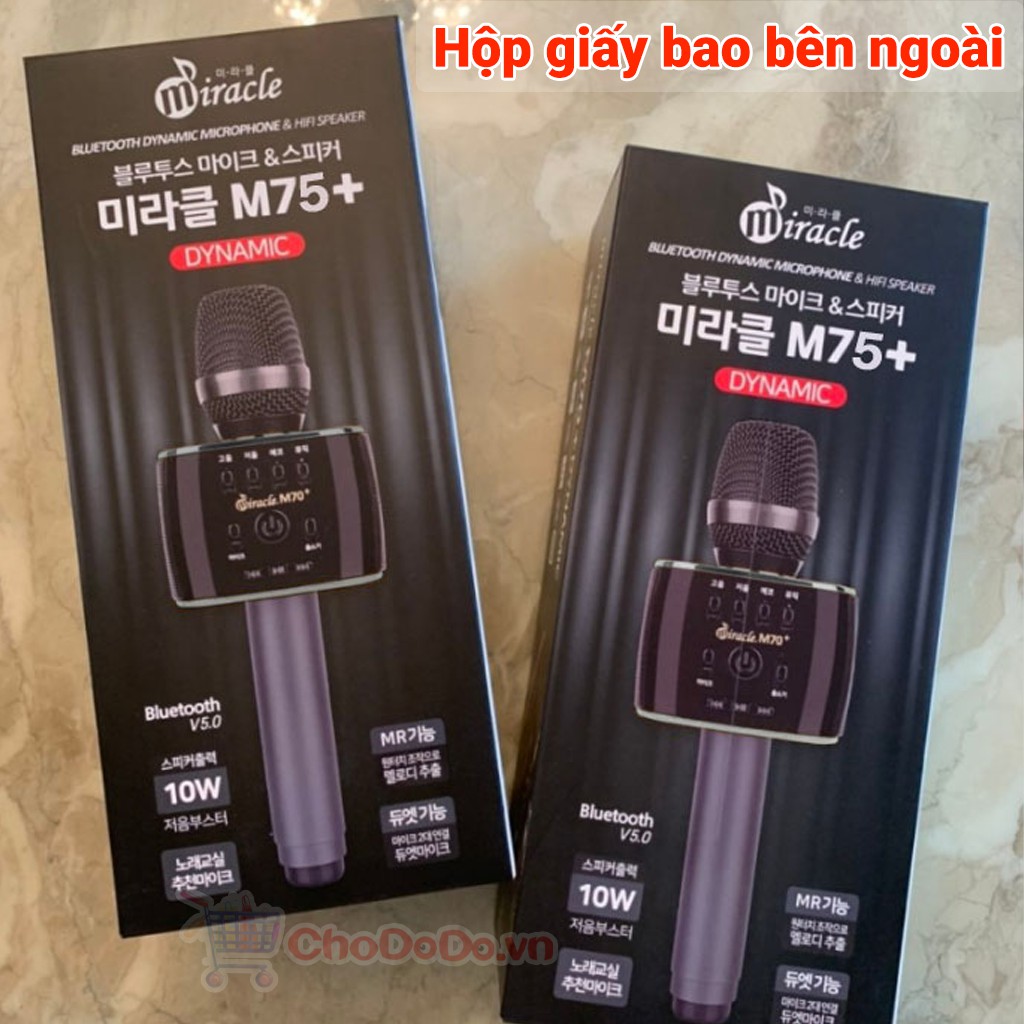Micro Karaoke Bluetooth Miracle M75+ (M75 Plus) là phiên bản nâng cấp và thay thế hoàn toàn cho chiếc micro Magicsing MP30 huyền thoại một thời (đã ngừng sản xuất) với âm thanh hay hơn, loại bỏ các lỗi từng có trên MP30 trước đây. Đây là 1 trong những dòng mic bán chạy nhất của Hàn Quốc, rất được ưa chuộng trên toàn thế giới và cả ở thị trường Việt Nam vì thiết kế đẹp, âm thanh hay, chất lượng tốt, an toàn khi sử dụng. Ngoài ra hãng MIRACLE còn có thêm dòng M70 và M100 cũng rất thịnh hành tại Việt Nam.🎁 Khi mua Miracle M75 Plus tại ChoDoDo.vn, các bạn sẽ được tặng kèm 01 đèn LED vũ trường + 01 giá đỡ điện thoại, bảo hành chính hãng 12 tháng.