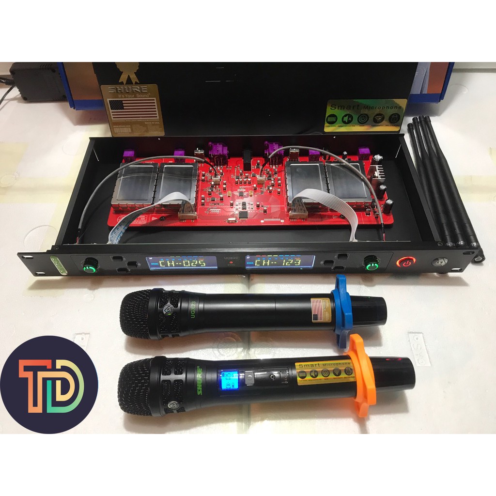Micro shu.rere-UGX23 2020 Karaoke Không Dây Main Đỏ Có ICCùng nhìn tổng quan về UGX23 sản phẩm mới 2020 từ seri UGX nổi tiếng, về cơ bản phụ kiện kèm theo thì cũng như các bản UGX khác. Tất cả đều được đóng gói cẩn thận và tỉ mỉ trong 1 bộ sản phẩm rất chắc chắn. Tông màu của vỏ hộp là màu xanh được thiết kế mới hoàn toàn trông rất đẹp và lịch sự.
