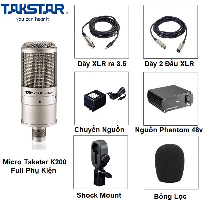 - Micro condenser Takstar PC-K200 SuitePC-K200 nằm trong Series micro condenser của Takstar thuộc dòng micro thu âm tốt nhất của Hãng. Micro PC-K200(Suite) được thiết kế đặc biệt cho việc thu âm để hát karaoke trên máy tính. Là bộ sản phẩm trọn gói gồm những thiết bị cơ bản nhất để tao lên một phòng thu tại gia cho bạn.