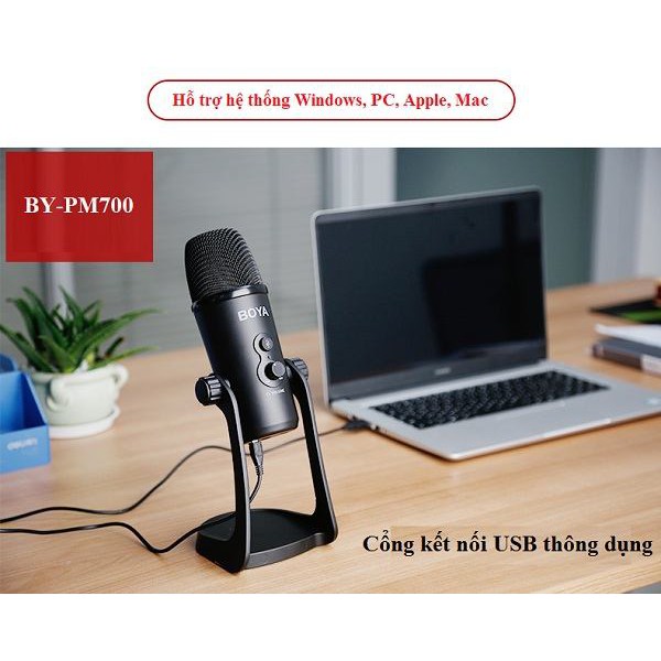Micro thu âm Boya BY-PM700 là dòng microphone cổng cắm USB, tương thích với máy tính hệ thống Windows và Mac. Với mô hình núm, cho phép bạn lựa chọn chế độ omni-directional, cardiod, âm thanh stereo và bi-derectional pickup, phù hợp trong nhiều trường hợp như ghi âm, cuộc phỏng vấn, hội nghị, thu âm giọng hát, podcasting và nhiều hơn nữa. Độ phân giải lên đến 16 bit/48 khz, và nó có tính năng điều khiển, nút mute, không có độ trễ đầu ra headphoneTHÔNG SỐ KỸ THUẬT