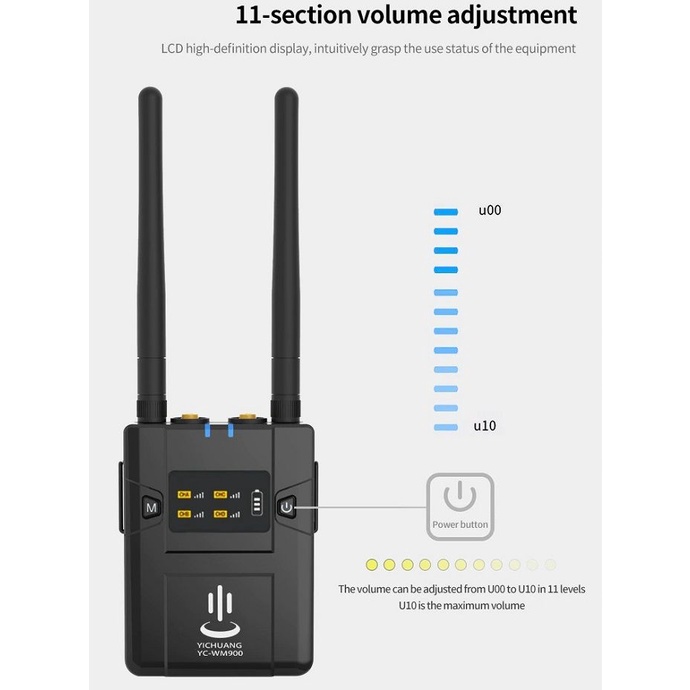 Micro thu âm cài áo 4 người YC-WM900 là dòng micro mới nhất 2021 của hãng sản xuất Yichuang dành cho máy ảnh máy quay hoặc điện thoại với khoảng cách thu xa lên đến 50m không có vật cản. Là dòng micro thế hệ mới lý tưởng cho các cuộc phỏng vấn, sản xuất blog video với kích thước nhỏ gọn dễ sử dụng với pin lithium tích hợp cho thời gian lên đến 7-8h liên tục. Ngoài ra micro YC-WM900 được trang bị màn hình led hiển thị tần số cũng như dung lượng pin một cách trực quan nhất.THÔNG SỐ KỸ THUẬT MICRO YC-VM900: