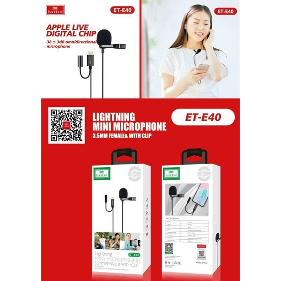 Mic Thu Âm Mini Cho Điện Thoại Chân Lightning kèm Jack Cắm Tai Nghe EarldomBên cạnh sản phẩm Mic Thu Âm Mini Cho Điện Thoại Chân Type C, chân 3.5mm Hãng đồ chơi công nghệ và phụ kiện điện thoại Earldom Việt Nam còn sản xuất ra Mic Thu Âm Mini Cho Điện Thoại Chân Lightning kèm Jack Cắm Tai Nghe Earldom E40