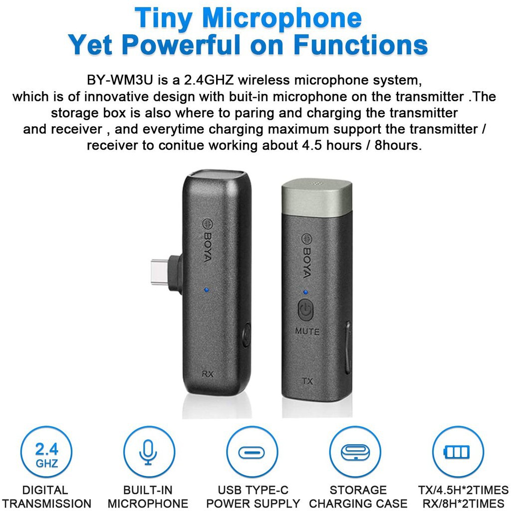 ◾ Tương tự Boya BY-WM3D. Dòng Boya BY-WM3U là micro thu âm không dây 2.4GHz mới nhất của hãng Boya. Với kiểu dáng nhỏ gọn và thiết kế “Interchangeable” thông minh, BY-WM3U có thể sử dụng linh hoạt với nhiều thiết bị: smartphone Android, máy ảnh, PC, laptop,… Hơn nữa, việc tích hợp sạc không dây tân tiến ngay trong hộp đựng dễ dàng cấp nguồn cho micro hoạt động bền bỉ cả ngày. BY-WM3U lý tưởng cho làm vlog, video, live stream, phỏng vấn.◾ Sử dụng công nghệ sóng không dây 2.4G, BY-WM3U không bị nhiễu sóng bởi sóng TV, radio, hay sóng UHF và có thể vận hành đồng thời 20 hệ thống (bộ) trong cùng một môi trường.