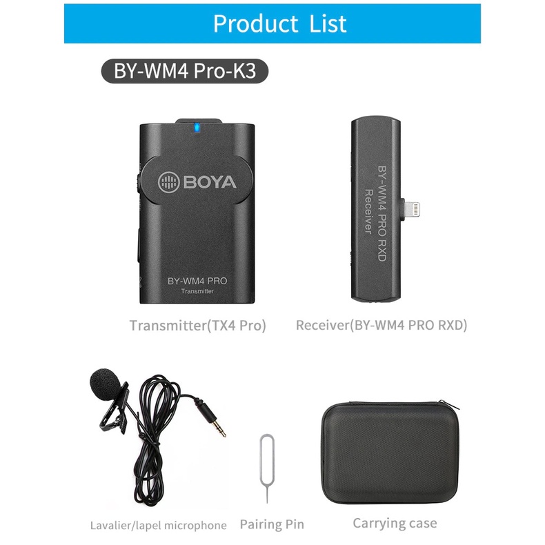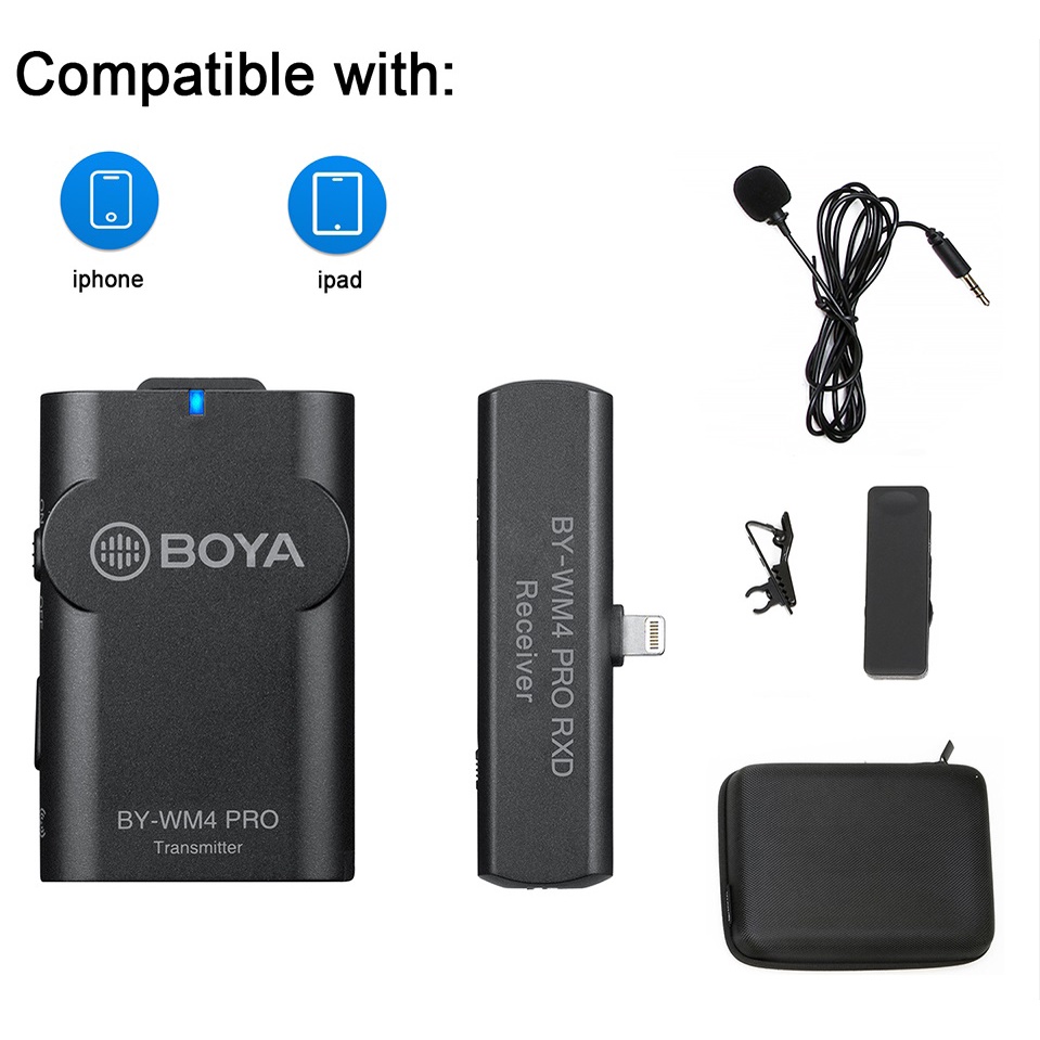 - Microphone BOYA BY-WM4 Pro-K3 được thiết kế dành riêng cho các thiết bị sử dụng giao diện kết nối Lightning như iPhone, iPad,.. phù hợp với nhiều ứng dụng không dây như phỏng vấn, báo chí di động, báo cáo, Vloggings, Podcast và hơn thế nữa.