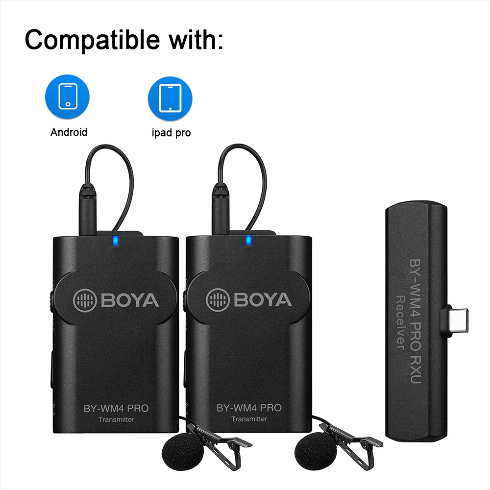 - Microphone BOYA BY-WM4 Pro-K6sử dụng tần số 2.4GHz được thiết kế dành riêng cho các thiết bị sử dụng giao diện kết nối cổng Type-C như điện thoại HĐH Android, Laptop,BY-WM4 Pro K6được trang bị nhiều hơn 1 bộ phát TX, vì vậy có thể sử dụng cho tối đa 2 người nói, phụ vụ mục đích quay phỏng vấn, Talkshow, hội thoại,...