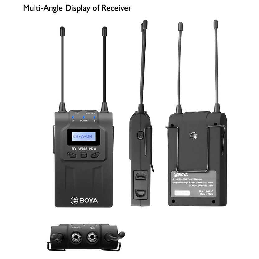 - BOYA BY-WM8 Pro-K2 là hệ thống micro không dây kênh đôi UHF được nâng cấp để thu lạiâm thanh từ 2 nguồn phát âm chính, một vài ưu điểm của bộ mic này như:có màn hình LCD dễ đọc dễ theo dõi thao tác sử dụng, băng thông RF chuyển mạch rộng, mạch điều chỉnh tổng hợp PLL và mạch điện tử kỹ thuật số.