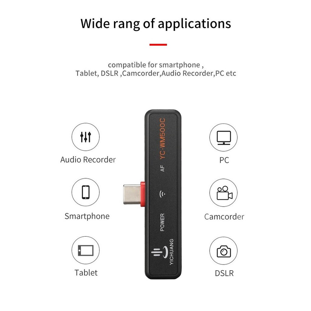 Micro thu âm không dây cổng Type-C 2 người YC-WM500C2 là một dòng micro mới của hãng sản xuất YICHUANG. YC-WM500C1 sử dụng tần số 470-510 MHz, được thiết kế dành riêng cho các thiết bị sử dụng cổng Type -C, đem lại âm thanh chất lượng cao phù hợp với nhiều ứng dụng không dây như phỏng vấn, quay vlog…Bộ mic sử dụng 4 kênh chuyển đổi khác nhau để tránh nhiễu với khoảng cách thu xa lên đến 50m không có vật cản.THÔNG SỐ KỸ THUẬT: