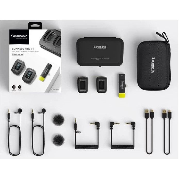Micro thu âm không dây Saramonic Blink 500 Pro B4 gồm một bộ thu RXDi và hai bộ phát TX. Đây là micro bộ thu kênh đôi được thiết kế để cung cấp âm thanh chất lượng cao dành cho các thiết bị cổng Lightning iOS như iPhone, iPad, iPod touch. Bộ thu Blink500 Di Lightning lấy nguồn trực tiếp từ Iphone Ipad được chứng nhận bởi MFi. Bộ phát Blink 500 Pro B4 có hai micro lavalier chuyên nghiệp SR-M1 tặng kèm.THÔNG SỐ KỸ THUẬT: