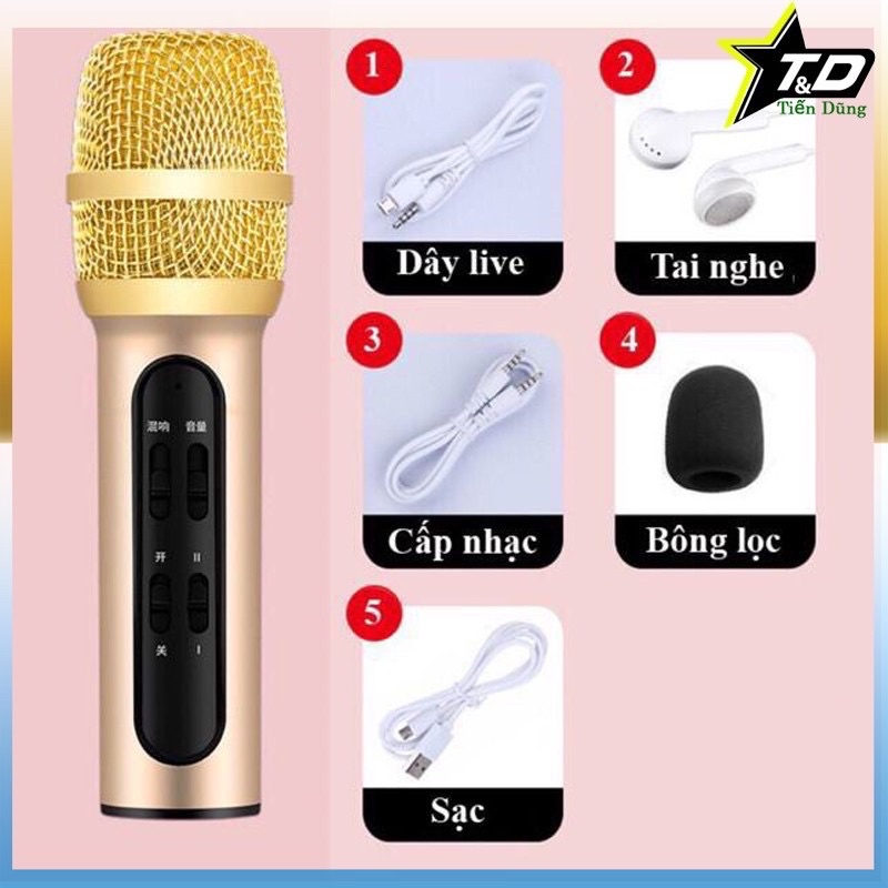 Bộ sản phẩm bao gồm: 1 Micro + 1 cap sạc + 1 cap âm thanh + 1 cap live + 1 tai nghe + 1 bông lọc + sách HDSD