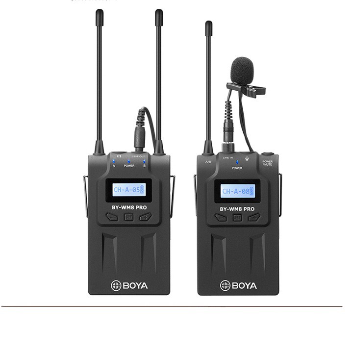 Micro Thu Âm Chuyên Nghiệp Không Dây Dành Cho Máy Ảnh Boya BY-WM8 Pro-K1Boya BY-WM8 Pro-K1 là một hệ thống micro kép không dây sử dụng tần sóng UHF vô cùng chuyên nghiệp và tiện lợi. Với thiết kế cho ENG, EFP,DSLR video, và dual-Channel có thể làm việc cùng lúc với cả hai máy phát. Micro Boya này sử dụng lên đến 48 kênh sóng UHF cùng nhiều dải tần riêng biệt, đảm bảo không trùng sóng và hoàn toàn loại bỏ hoàn toàn nhiễu tín hiệu. Ngoài ra, Microphone này còn có thời gian thu phát trực tiếp lên tới 6h liên tục chỉ với 2 viên pin tiểu AA, UHF Wireless Microphone Boya BY-WM8 Pro-K1 sẽ là một sản phẩm hoàn hảo dành cho bạn.