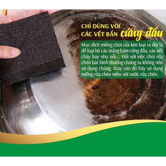 - Một miếng dùng được 3 - 4 tháng nếu dùng liên tục mới phải thay, có thể giặt sạch nước phơi khô. Cọ mọi vật dụng cáu bẩn trong nhà như: gạch men, dao, kéo, đồ nhựa, gỗ, nồi niêu xoong chảo các loại...