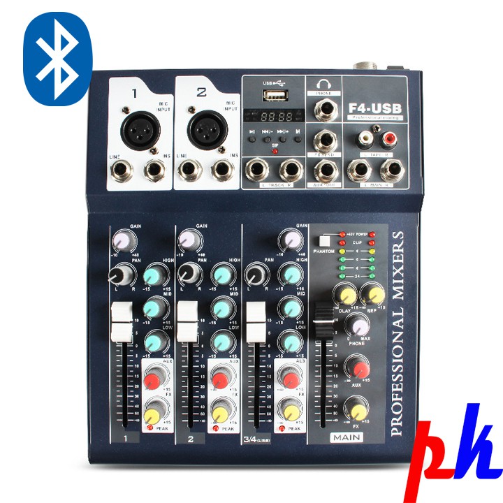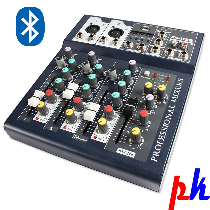 Bộ trộn âm thanh mixer F4-USB có bluetooth là dòng mixer mini xử lý hiệu ứng âm thanh chất lượng cao với 4 kênh đầu vào, cung cấp nguồn phantom 48V cho mic condenser, hỗ trợ nghe nhạc, thu âm và hát karaoke.
