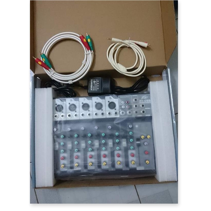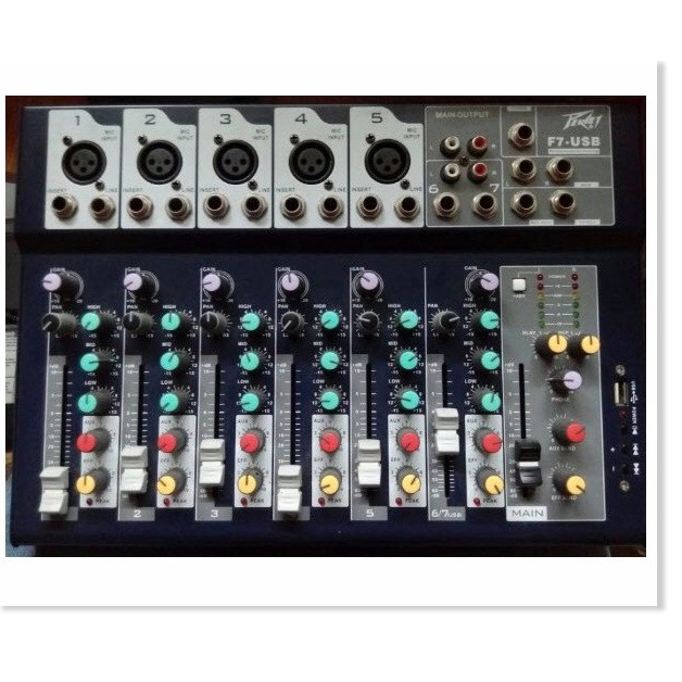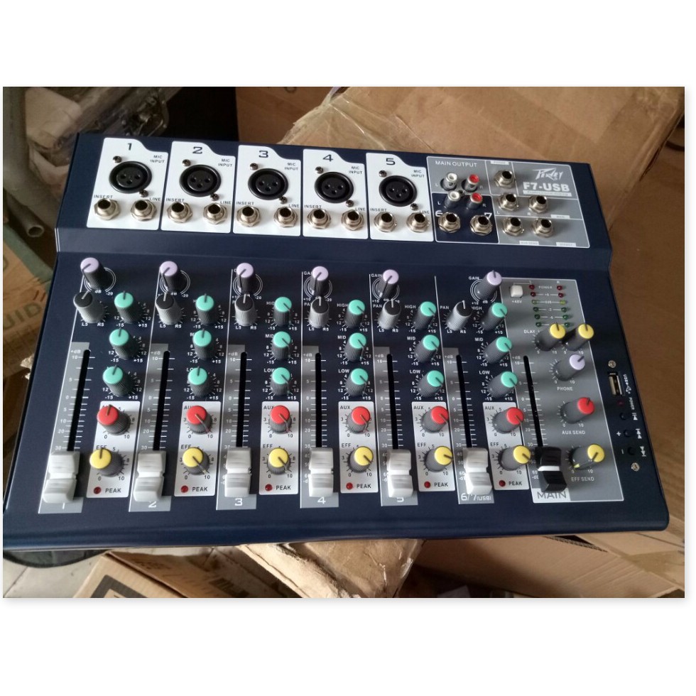 MIXER ban 5LINE PEVEY F7 USBSản phẩm MIXER bàn PEVEY f7 là dòng sản phẩm cao cấp đc sự dụng cho âm thanh gia đình hoặc kinh doanh, sân khấu karaoke vv.v.v..Với thiềt kế nhỏ gọn dễ dàng sắp xếp mà ko tốn diện tích, sản phẩm bạn điều chỉnh tốt những âm thanh và bass trelp sống động và tuyệt hảo đến 1cách chuyên nghiệp nhất..trải nghiệm với mixer PEVEY F7 cho bạn âm thanh TUYỆT HẢO như đem cả rạp hát về nhà..Ưu điểm nổi bật của Mixer PEVER F7:- Mixer Peavey F7 cho chất lượng âm thanh đầu ra rất sắc nét, sâu và khi được cân chỉnh hợp lý sẽ mang đến hiệu quả rất bất ngờ, hoàn mỹ đến khó tin.- Mixer Peavey F7 hỗ trợ tốt 5 đường (line) mono/mic và 1 đường stereo và 5 đường vào micro jack canon- Hỗ trợ kết nối: USB, Main, AUX, Effect, Jack phone 6 li, jack Insert- Có chức năng Compressor: Giúp nén và cân chỉnh tỷ lệ xuất âm thanh.- Low Cut: Giúp cắt tần số thấp khi bị hụt hơi trong diễn thuyết và các nhạc cụ- Có ứng dụng chơi trống, guitar, nhạc cụ và chống Feeback microphone.- Có nguồn Phantom.- Nguồn điện của Peavey F7 là 48V qua bộ đổi điện 220V (adapter).- Mixer Peavey F7 có thể kết hợp với mọi Amply