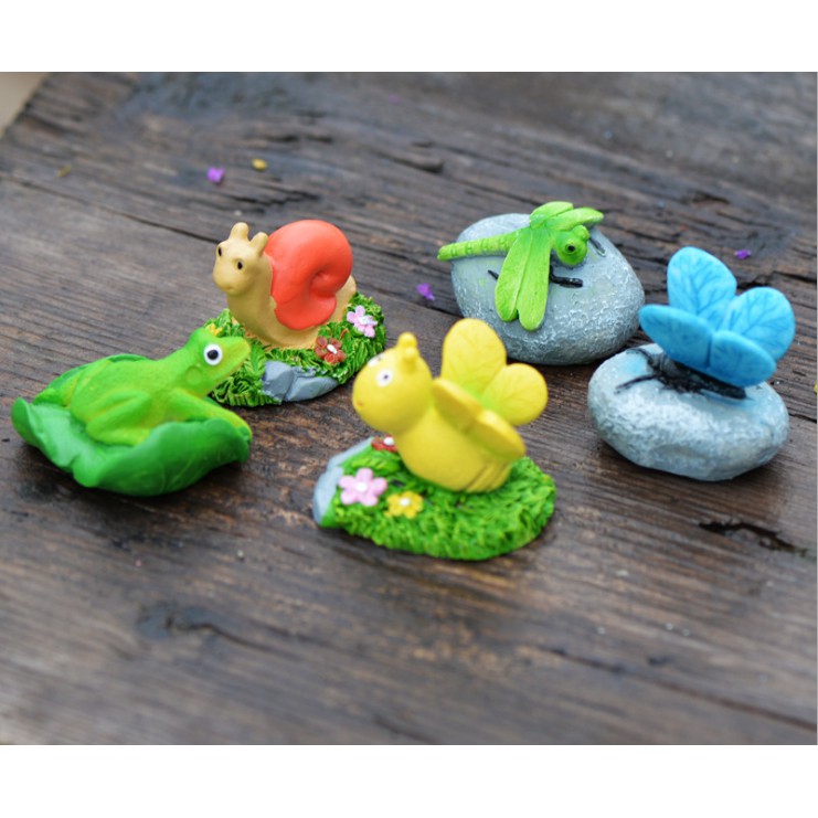 Mô hình ếch ngồi lá sen xanh, bướm xanh, ong vàng, ốc sên, bọ dừa, chuồn chuồn trang trí tiểu cảnh, DIY