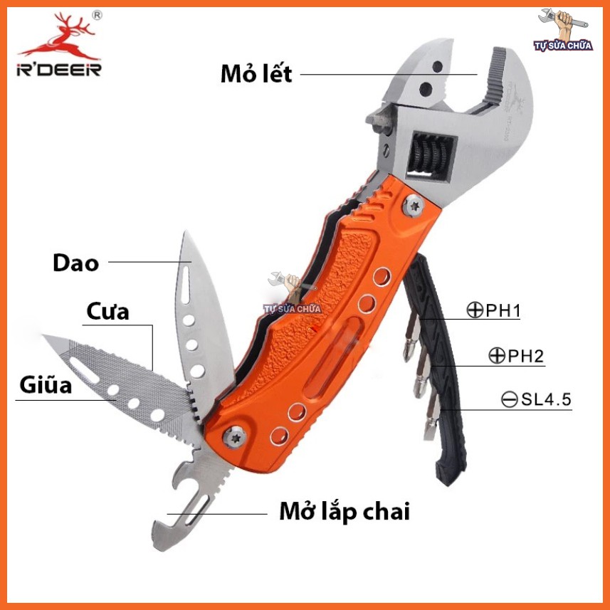 Mỏ lết đa năng cao cấp 8 trong 1 R’DEER RT-2353, nhỏ gọn, tô vít, dao, cưa, giũa, mở nắp chai, thiết kế thông minh
