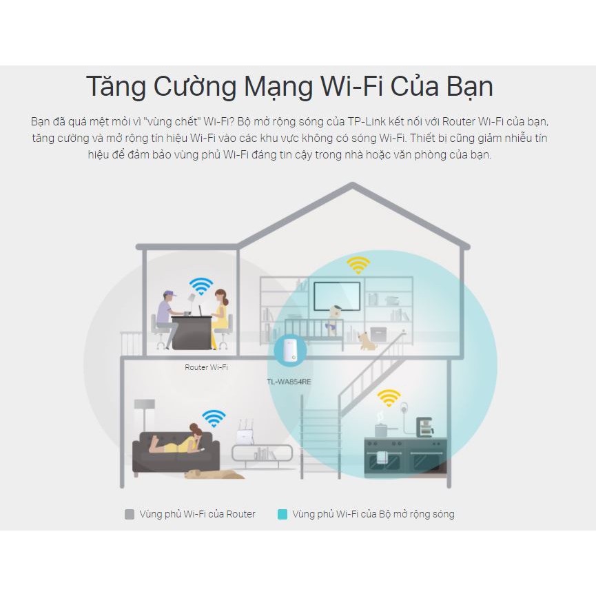 Bạn đã quá mệt mỏi vì "vùng chết" Wi-Fi? Bộ mở rộng sóng của TP-Link kết nối với Router Wi-Fi của bạn, tăng cường và mở rộng tín hiệu Wi-Fi vào các khu vực không có sóng Wi-Fi. Thiết bị cũng giảm nhiễu tín hiệu để đảm bảo vùng phủ Wi-Fi đáng tin cậy trong nhà hoặc văn phòng của bạn