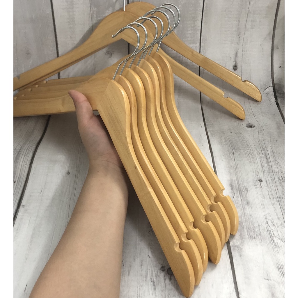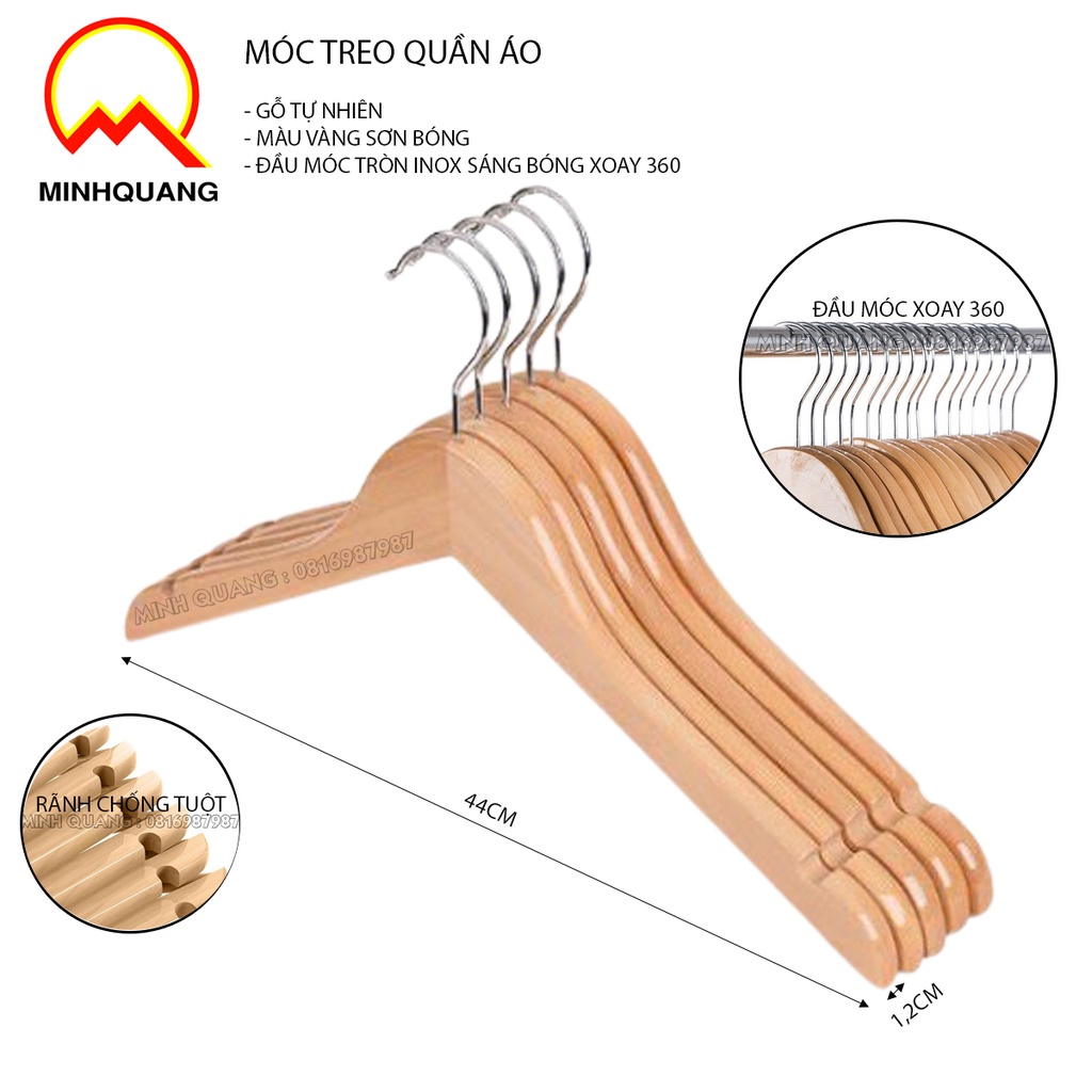 Nhà cửa & Đời sống > Sắp xếp nhà cửa > Mắc áo || móc treo quần áo nam nữ bằng gỗ, màu vàng cổ tròn, đầu móc inox sáng bóng xoay 360, dùng cho cửa hàng và shop thời trangCòn hàng