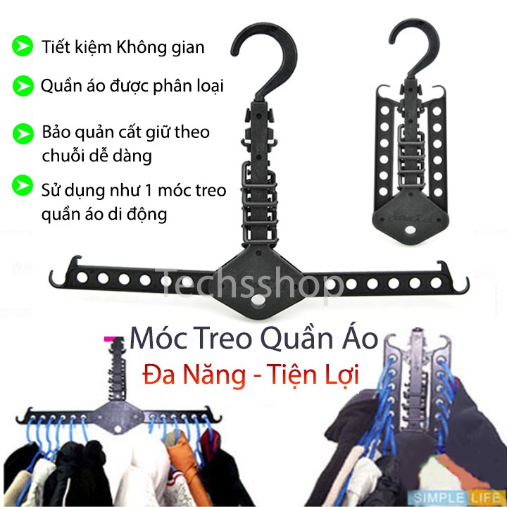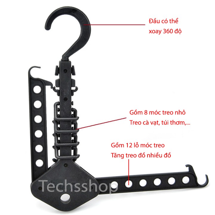 Móc treo có quần áo có thể xoay 360 độ, gồm 13 lỗ treo thêm móc và 8 móc nhỏ treo cà vạt hay túi thơm, 2 móc treo ngoài.