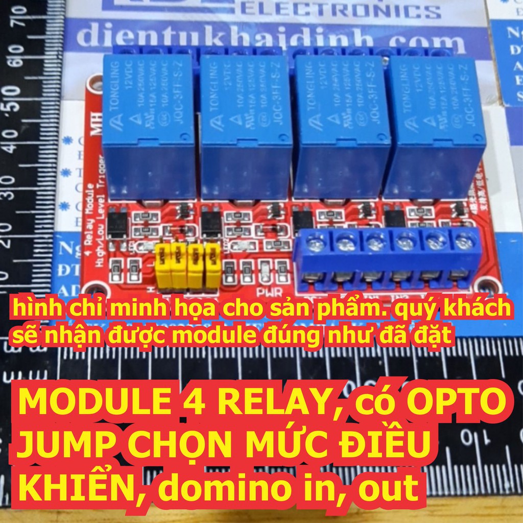 Giới thiệu MODULE 4 RELAY, có OPTO, JUMP CHỌN MỨC ĐIỀU KHIỂN, domino in, out, relay 12V / 5V / 24V kde6794