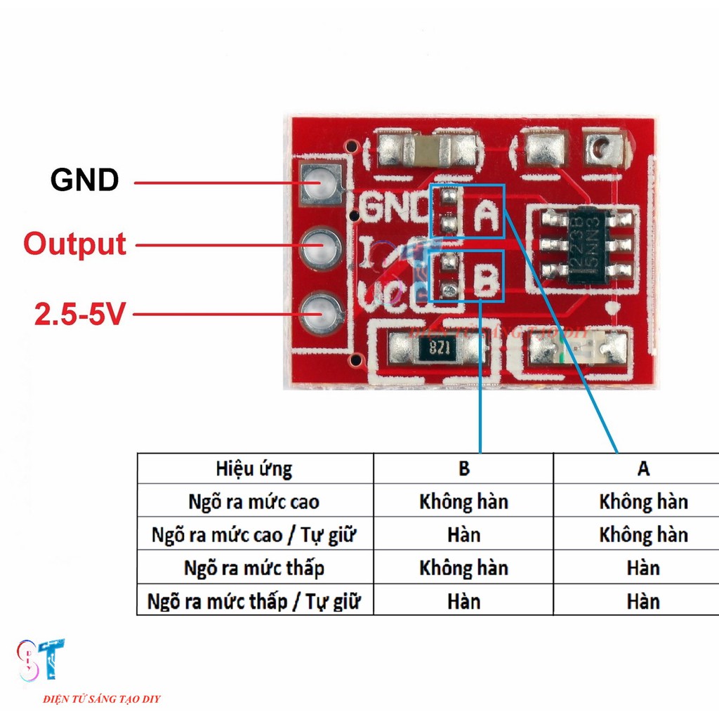 - trên mạch có 4 điểm chưa hàn chia làm 2 cặp A B ta hàn hoặc không hàn 2 cặp giăm này để chọn chế độ hoạt động của mạch. Nhấn để chuyển tín hiệu ra từ mức thấp lên mức cao hoặc ngược lại hàn B hàn A hoặc không hàn A. Bình thường đầu ra ở mức thấp, khi nhấn tín hiệu đầu ra lên mức cao không hàn A B Bình thường đầu ra ở mức cao. Khi nhấn tín hiệu đầu ra xuống mức thấp hàn A không Hàn B.
