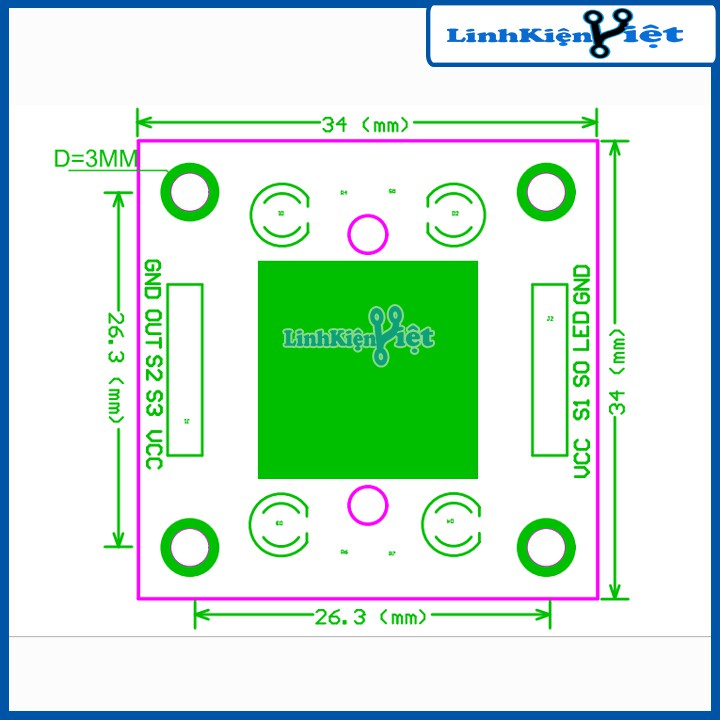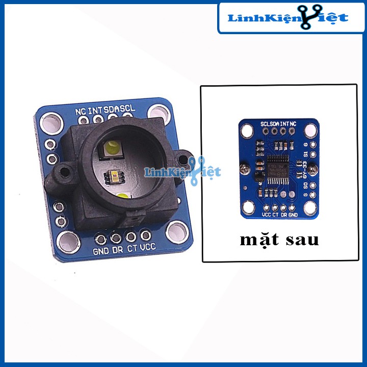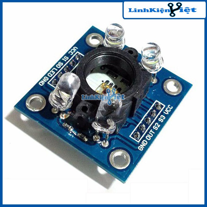 +Linh kiện điện tử Module cảm biến màu TCS3200 với khả năng nhận biết 3 mầu cơ bản RGB và 4 đèn LED trắng. Các TCS3200 có thể phát hiện và đo lường gần như tất cả màu sắc có thể nhìn thấy. Ứng dụng bao gồm kiểm tra đọc dải, phân loại theo màu sắc, cảm biến ánh sáng xung quanh và hiệu chuẩn, và kết hợp màu sắc, đó chỉ là một vài ứng dụng. TCS3200 có các bộ tách sóng quang, có 2 bộ lọc màu sắc là bộ lọc màu đỏ, xanh dương, hoặc màu xanh lá, hoặc không có bộ lọc ( rõ ràng). Các bộ lọc của mỗi màu được phân bố đều khắp các mảng để loại bỏ sai lệch vị trí giữa các điểm màu. Bên trong là một bộ dao động tạo ra đầu ra sóng vuông có tần số là tỷ lệ thuận với cường độ của màu sắc lựa chọn.