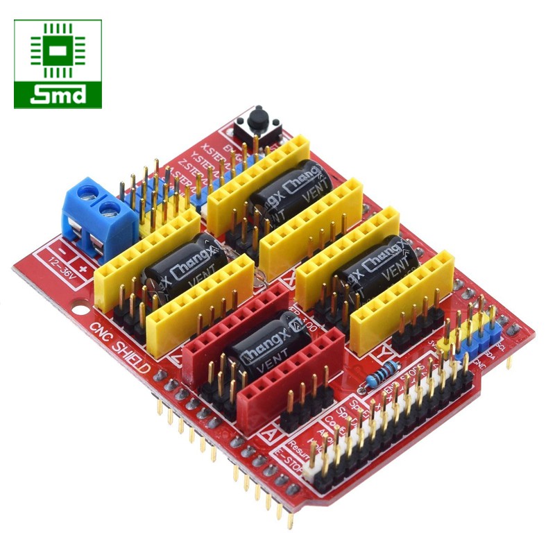 CNC shield V3 là board mở rộng của Arduino UNO R3 dùng để điều khiển các máy CNC mini. Board có 4 khay dùng để cắm các mô đun điều khiển động cơ bước A4988, khi đó board có thể điều khiển 3 trục X, Y, Z và thêm một trục thứ 4 tùy chọn trên các máy CNC mini.