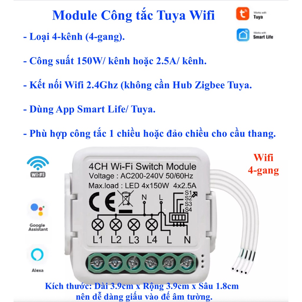- Kết nối Wifi 2.4Ghz, KHÔNG cần có Hub/ Gateway Zigbee Tuya.